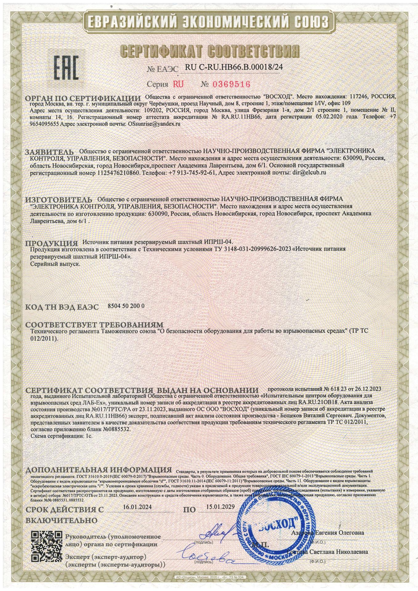 Источник питания резервируемый шахтный ИПРШ-04, сертификат соответствия № ЕАЭС RU C-RU.НВ66.В.00018/24 [ Скачать ]