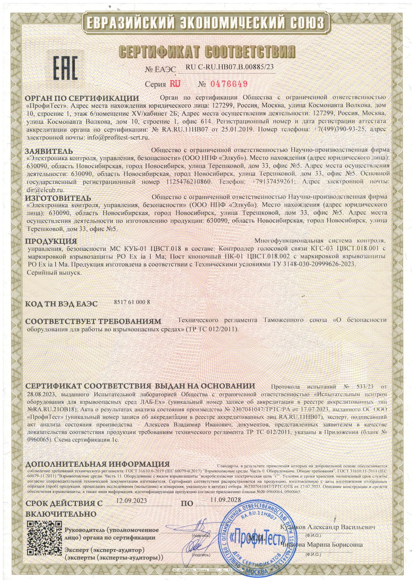Многофункциональная система контроля, управления, безопасности МС КУБ-01, сертификат соответствия № ЕАЭС RU C-RU.НВ07.В.00885/23 [ Скачать ]