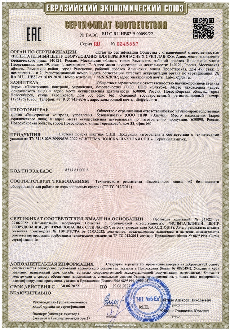 Система поиска шахтная СПШ, сертификат соответствия № ЕАЭС RU C-RU.НВ82.В.00099/22 [ Скачать ]