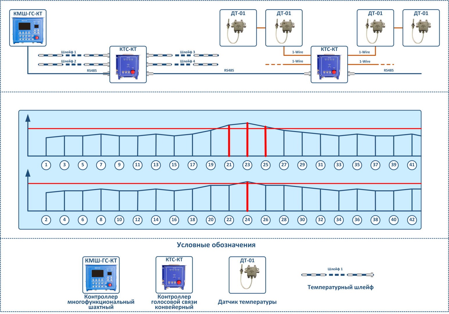 Информация об измеренных значениях температуры со всех термошлейфов, подключенных к контроллеру по интерфейсу RS-485 передается в контроллер многофункциональный шахтный для управления конвейерным транспортом КМШ-ГС-КТ и далее диспетчеру.