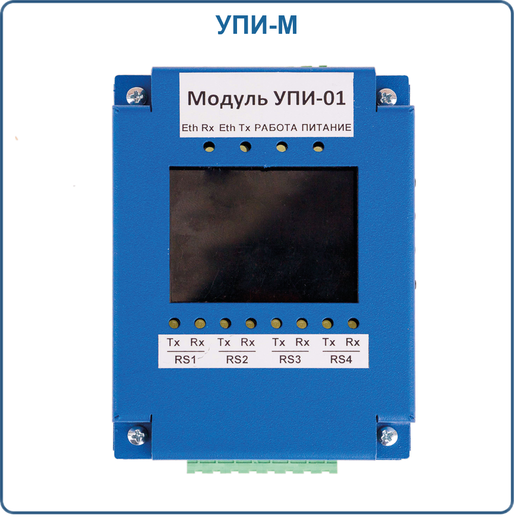 Модуль преобразования интерфейсов УПИ-М имеет 4 независимых изолированных интерфейса RS-485 и TFT дисплей с клавишами управления, позволяющий проводить диагностику работы и настройку режимов непосредственно на устройстве. Также модуль выполняет функцию искробезопасного барьера.